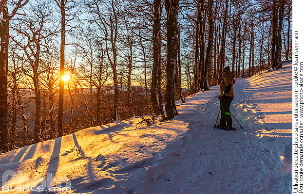 Alsace arbre contre-jour femme foret GR5 Haut-Rhin hetraie hetre hiver neige Parc naturel régional des Ballons des Vosges parc naturel regional photo horizontal randonnee raquette soleil (lever) sous-bois sport d'hiver vosges Vosges du Sud