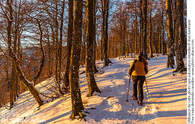 Photo : Randonnée en raquettes sur le GR5 dans la forêt en hiver au lever de soleil, Parc naturel régional des Ballons des Vosges, Haut-Rhin (68) - (ref. 240112-030) © Jean Isenmann