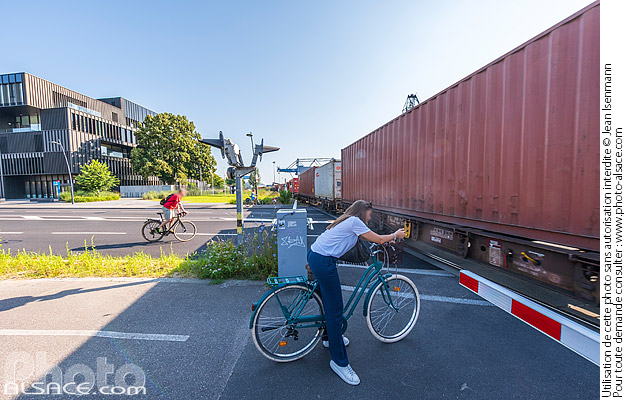 Alsace conteneur cycliste passage a niveau photo horizontal piste cyclable Quartier Coop Quartier du Port du Rhin Rue du Port du Rhin Strasbourg train