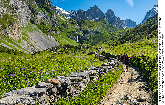 Parc national de la Vanoise été alpes chemin de grande randonnee GR55 montagne mur de pierre paysage de montagne photo horizontal Pointe de la Grande Glière Pointe de la Vanoise Pralognan-la-Vanoise Rhône-Alpes Savoie