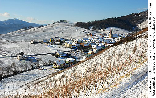 eglise hiver maison neige paysage viticole photo horizontal route des vins d'alsace vallon vigne vignoble village