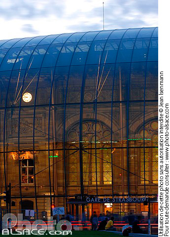 architecture contemporaine facade gare Gare de Strasbourg gens illumination lumiere nuit photo vertical tgv transparence verriere