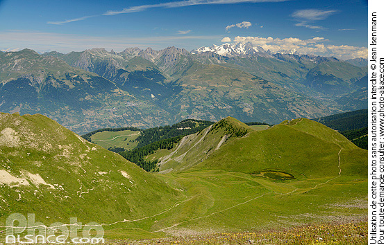 Lac Bovet et col du Lac en arrière plan le massif du Mont Blanc, Notre Dame du Pré, Tarentaise, Lac Savoie (73)