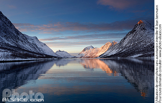 eau fjord Gryllefjorden hiver Ile de Senja montagne neige Norvège Norway paysage photo horizontal reflet Senja