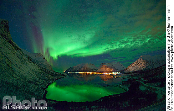 aurore boreale aurore polaire Bergsbotn Bergsfjorden ciel eau fjord hiver Ile de Senja Norvège Norway nuit paysage photo horizontal reflet Senja