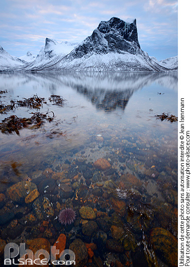 eau fjord hiver Ile de Senja montagne neige Norvège Norway paysage photo vertical reflet Senja