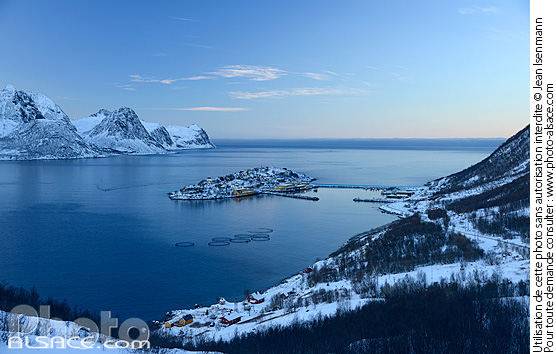 eau hiver ile Ile de Senja mer montagne neige Norvège Norway photo horizontal Senja village village de pecheurs vue de haut