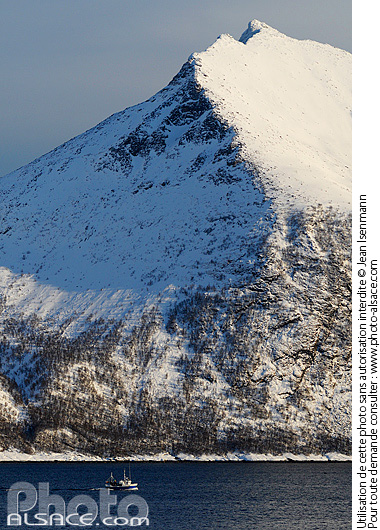 bateau bateau de peche eau hiver Ile de Senja montagne neige Norvège Norway paysage photo vertical Senja