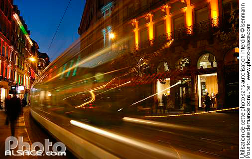 flou illumination lumiere Marche de Noel de Strasbourg nuit rame de tramway rue transport en commun vitesse
